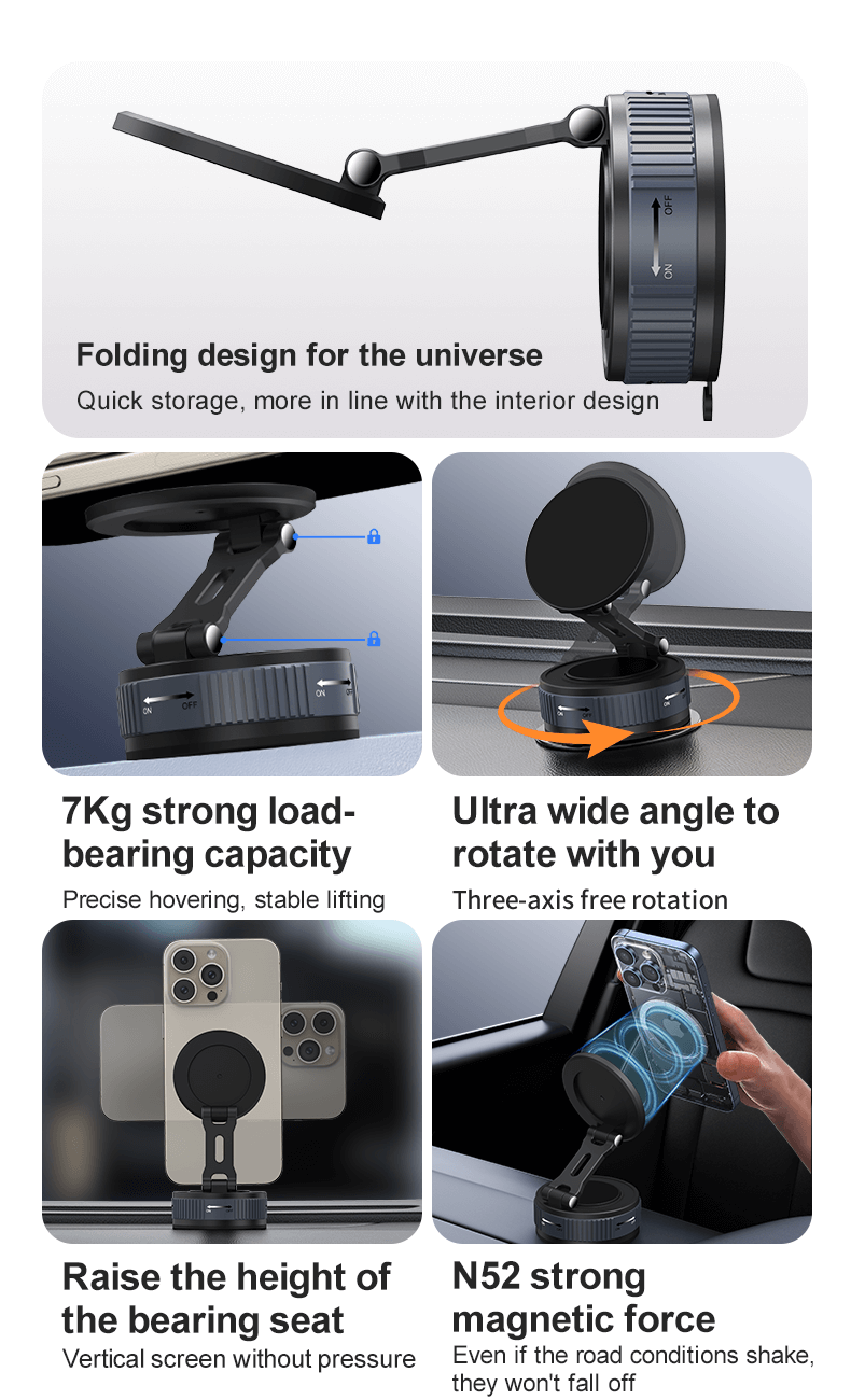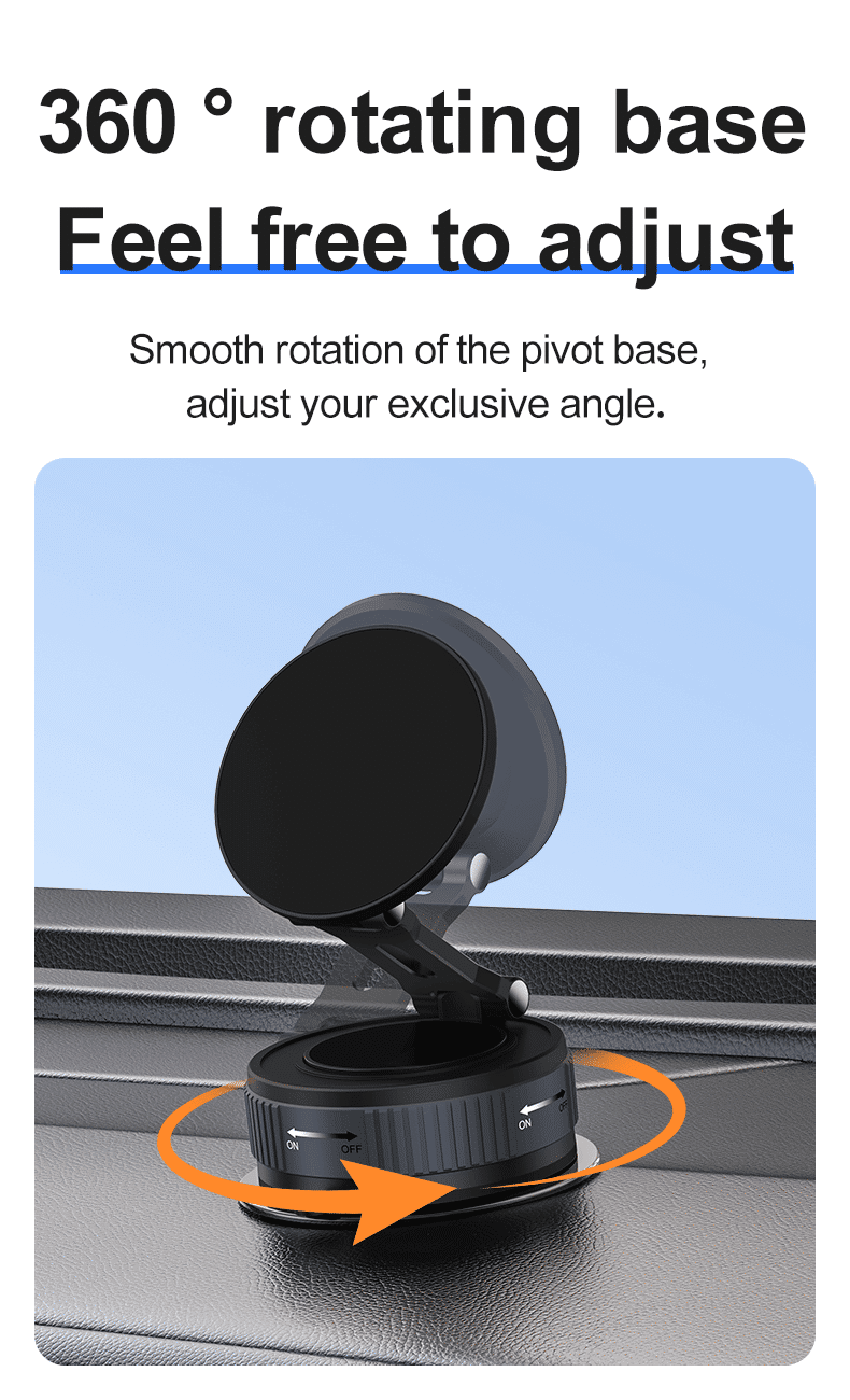 The twist-lock suction base allows for quick, firm installation and removal without residue. It rotates 360°, enabling flexible positioning for any situation.